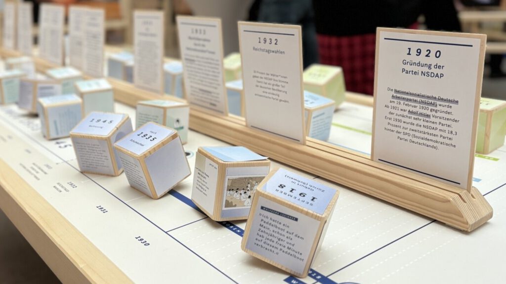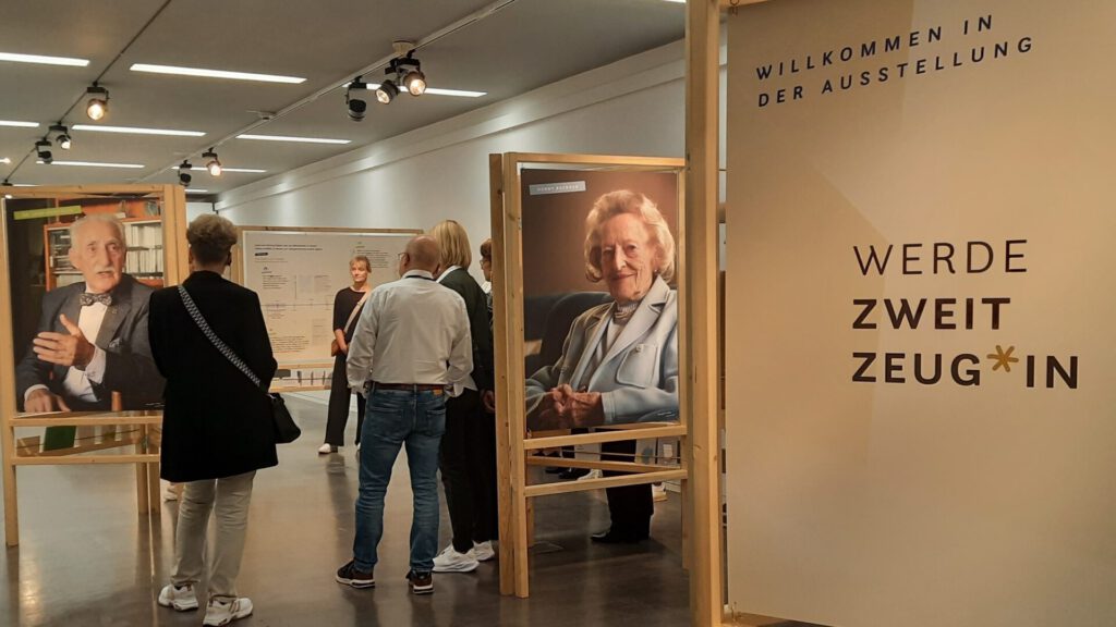 Ihre Biografien werden durch (historische) Kontextinformationen in mehreren Themenfeldern ergänzt, zum Beispiel Kontinuitäten von Antisemitismus. Immer wieder wird dabei ein Übertrag ins Heute in die Lebenswelt der (jungen) Besucher*innen geschaffen. Durch multimediale Inhalte, Audiobeiträge und zahlreiche Interaktionen lädt die Ausstellung ein, auch darüber hinaus als Zweitzeug*in aktiv zu werden.