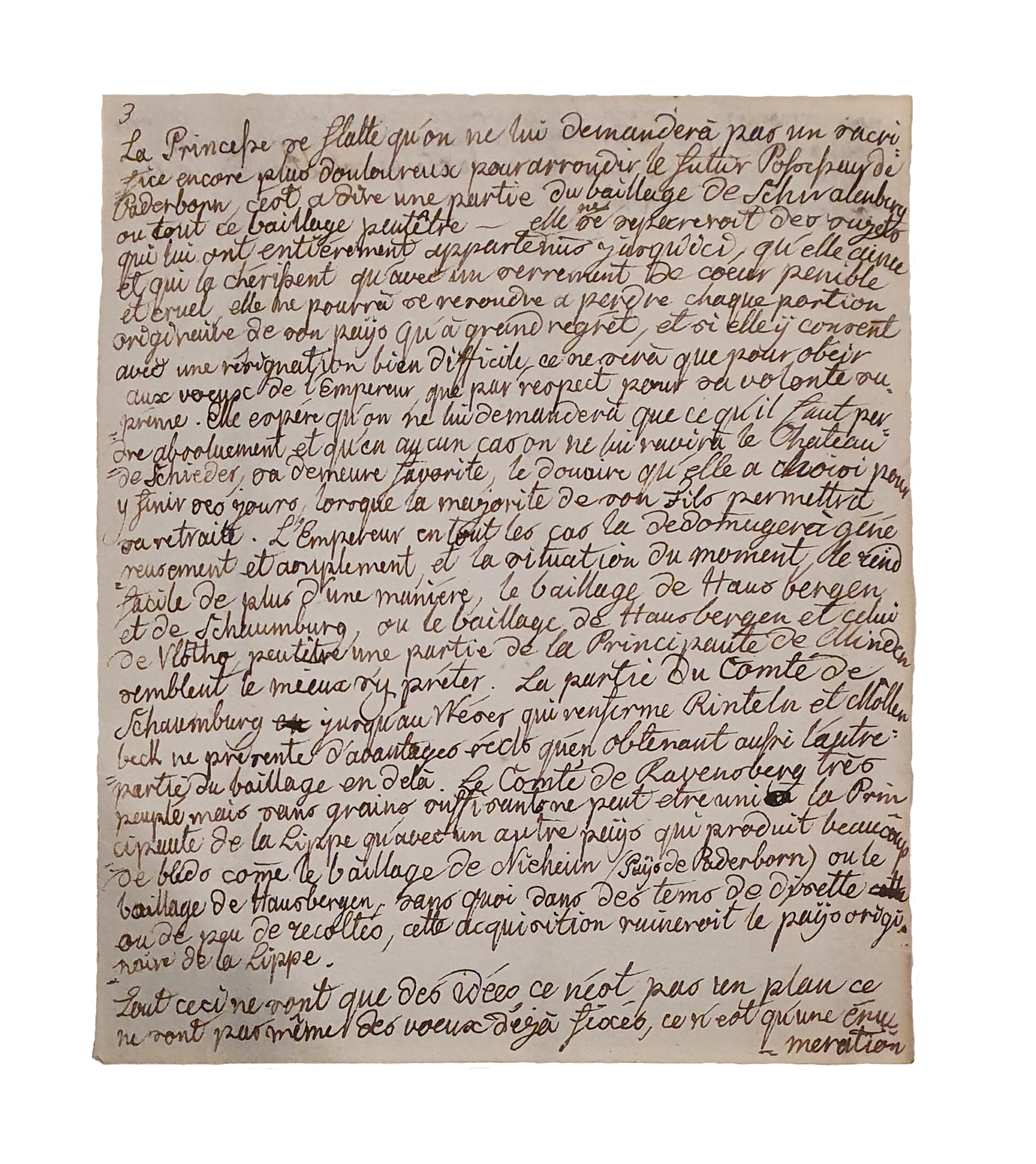 Ein außergewöhnliches Stück Lippischer Geschichte ist Paulines handschriftliches Memorandum „Idées“, das sie zur Vorbereitung ihres Treffens mit Napoleon verfasste. In präzisen französischen Notizen plante sie ihre Argumente und dokumentierte ihre diplomatische Klugheit. Zwischen den Zeilen erscheinen vertraute Ortsnamen wie Schaumburg, Paderborn und Lippe – Zeugnisse einer Fürstin, die Politik mit Weitblick betrieb.