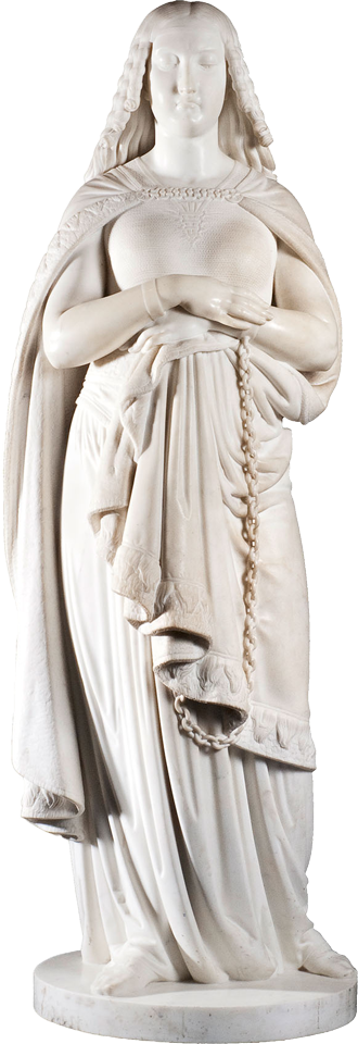 Thusnelda, die Gemahlin des Cheruskerfürsten Arminius, ist uns nur durch die Schriften des römischen Historikers Tacitus bekannt. In der Ausstellung begegnet man ihr gleich mehrfach: auf Gemälden des 19. Jahrhunderts, die nationale Mythenbilder spiegeln, in der von Ernst von Bandel geschaffenen Skulptur aus Carrara-Marmor oder als Symbolfigur, die bis heute als Werbeikone genutzt wird.
